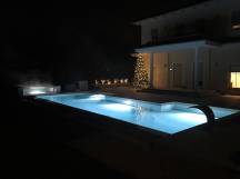 Blick über beleuchteten Whirlpool und Swimmingpool